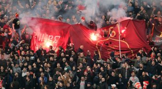 - Izabrali ste pogrešno društvo - pisalo je na transparentu Delija, a pored toga je barjak navijačke grupe "Fedajn" goreo! Pristalice crveno-belih su sve ispratili poznatom pesmom Novih fosila.