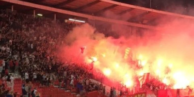 Igrači su prišli severnoj tribini, odmah su krenule navijačke pesme uz bakljadu.