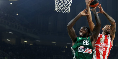 2. minut - Zvezdina odbrana jeste dobro počela, ali defanzivni skok je očajan. Kostas Adetokumbo postiže prve poene za PAO na ovom meču, na asistenciju Slukasa.