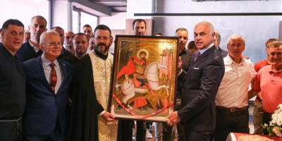 - Najpre bih želeo da vam čestitam najveći hrišćanski praznik, zaposlenima, kao i igračima, uz pravoslavni pozdrav Hristos Vaskrse, Vaistinu Vaskrse. Zatim vam čestitam krsnu slavu kluba, koju veoma svetovno proslavljate svake godine, uz želju da Sv. Velikomučenik Georgije, kao vaš zaštitnik i nebeski čuvar uvek bude na pomoći. Ovo su dani velike radosti za nas pravoslavne hrišćane. Nakon veoma uspešne sezone, želimo vam da sledeća godina bude još bolja nego ova i da nam gospod podari zdravlja i svako dobro. Crvena zvezda na osnovu veličine kluba zaslužuje da ima jednu takvu ikonu svoga zaštitnika, a kao što svi znamo FK Crvena zvezda je i u svoj statut uneo proslavu Sv. Velikomučenik Georgije, kao svoju krsnu slavu. Nadamo se da će ova ikona, na posebnom mestu krasiti stadion i da će svako u nekom momentu moći da priđe, i da se pomoli ne samo za rezultat, već za sebe i svoju porodicu – istakao je otac Dragan Šovljanski.