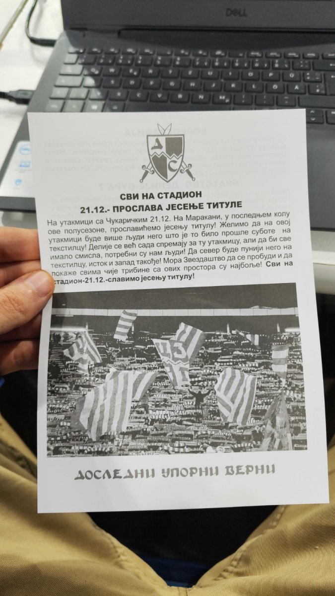 19.40 - Na drugom papiriću pozvali su navijače na fudbalsku utakmicu sa Čukaričkim i proslavu jesenje titule.