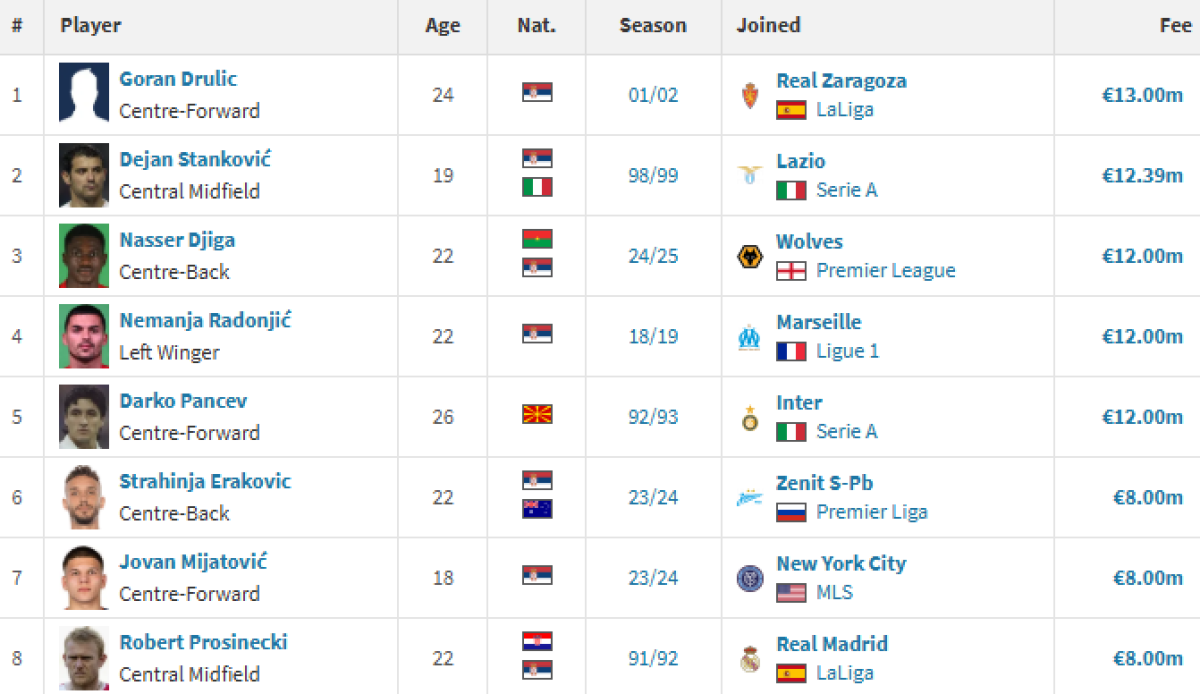 Ispred njega su samo Goran Drulić koji je 2001. prešao u Saragosu za 13 miliona i Dejan Stanković koji je kao devetnaestogodišnjak pojačao Lacio za 12,39 miliona evropskih novčanica.