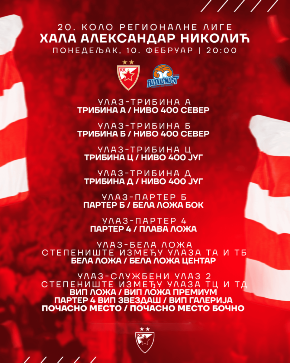 "Podsećamo da je klub kažnjen sa dve utakmice bez prisustva navijača na mestima pored terena (court seat), od čega je deo kazne odrađen na utakmici sa Splitom. Raspored sedenja za vlasnike svih karata pored terena ostaje poptuno isti kao i za utakmicu sa Splitom – svi vlasnici court seat mesta pored terena biće prebačeni u VIP ložu", obavestili su sa Malog Kalemegdana.