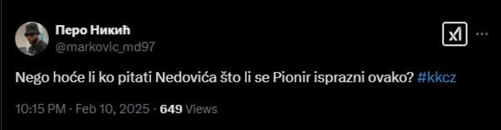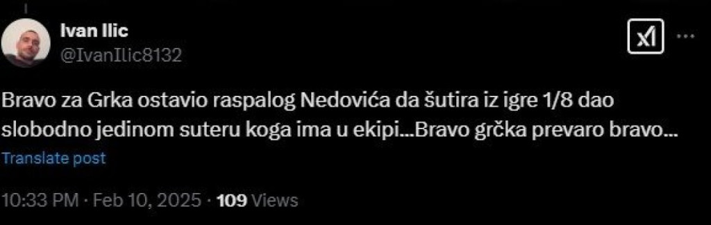 "Bravo za Grka, ostavio raspalog Nedovića da šutira iz igre 1/8, dao slobodno jedinom šuteru koga ima u ekipi... Bravo grčka prevaro, bravo", "Nedoviću, povredi se", "Idi prodaj avokado tost na Dorćolu, batali košarku menstruacijo jedna", "Nego, hoće li neko pitati Nedovića što li se Pionir isprazni ovako?", "Otići ćeš Nedoviću, kad tad"...
