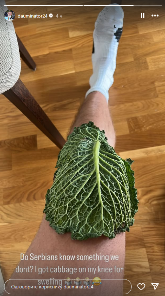 „Je li to Srbi znaju nešto što mi ne znamo? Stavio sam list kupusa na svoje otečeno koleno“, napisao je Daum uz postavljenu fotografiju.