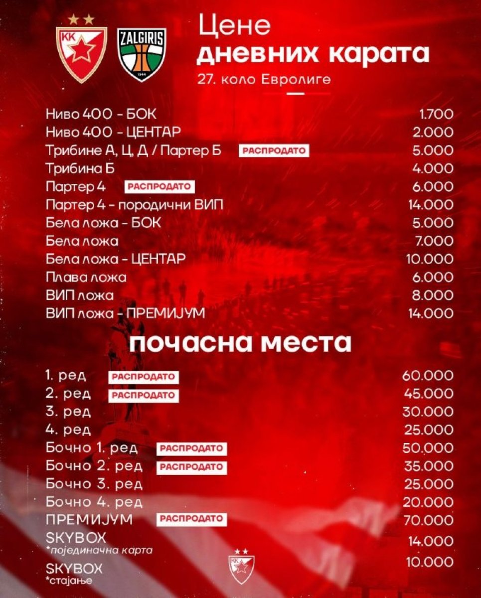 Košarkaški klub Crvena zvezda saopštio je da prodaja karata za utakmicu 27. kola Evrolige protiv Žalgirisa počinje u sutra, u četvrtak, 20. februara 2025. godine.