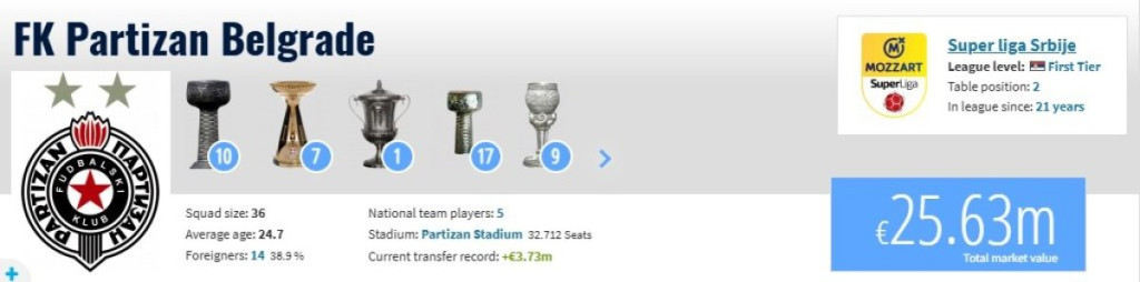 Međutim, još jedan podatak ljubiteljima fudbala ozbiljno upada u oči. Naime, prvi tim Crvene zvezde, po proceni "Transfermarkta", vredi 70,55 miliona evra, dok je Partizanov neuporedivo jeftiniji - 25,63.