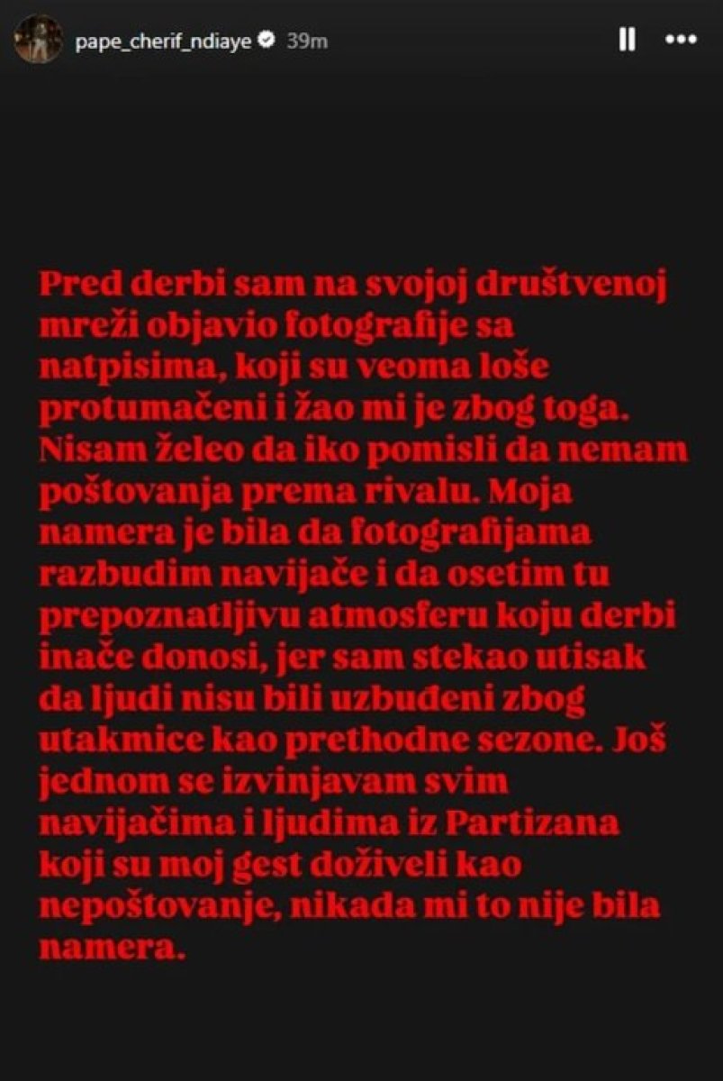 Oglasio se Šerif Ndijaje nakon 175. večitog derbija i izvinio se za kontroverznu objavu koju je objavio na svom "Instagramu" dan pred meč sa Partizanom.