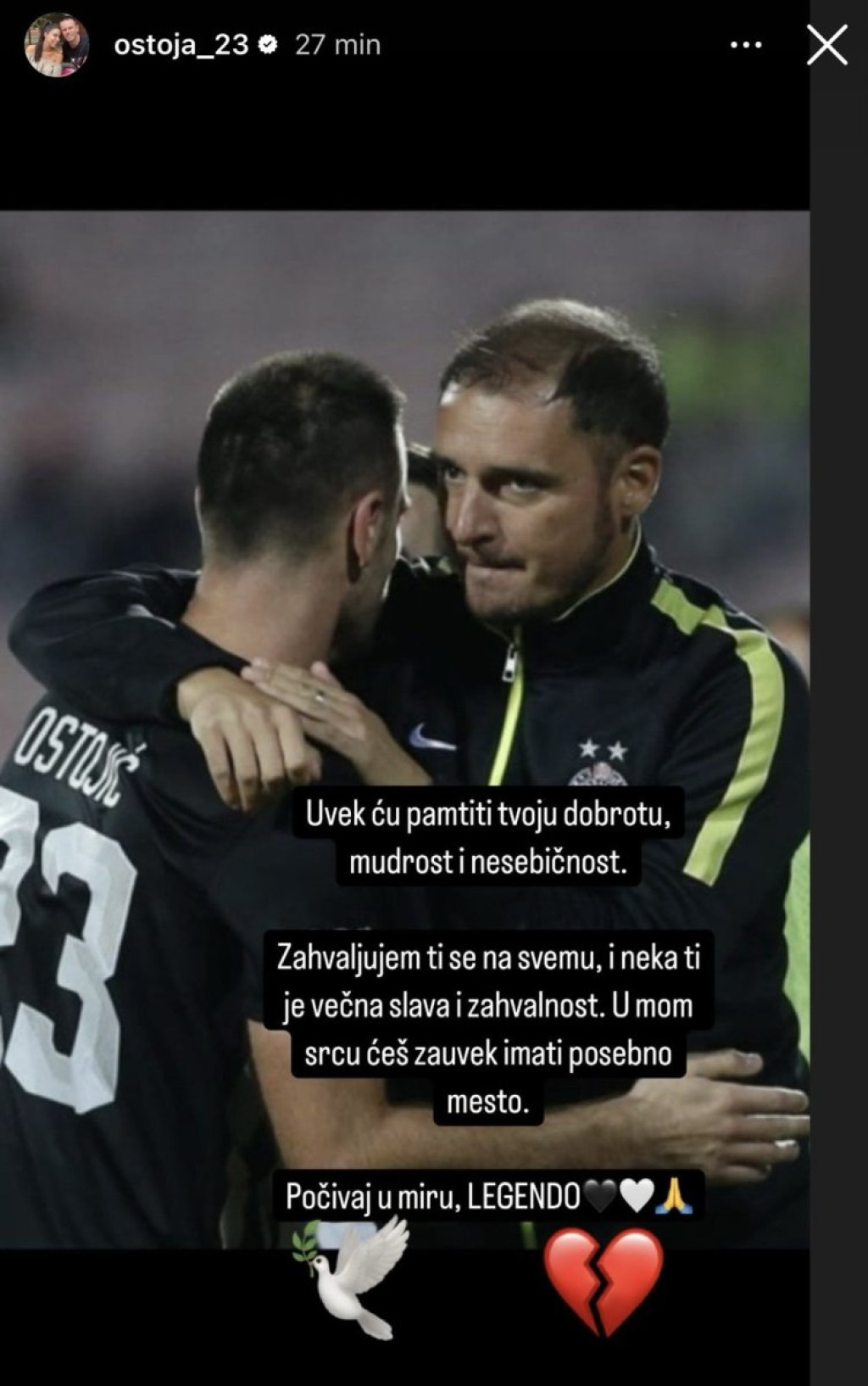 "Uvek ću pamtiti tvoju dobrotu, mudrost i nesebičnost. Zahvaljujem ti se na svemu, neka ti je večna slava. U mom srcu ćeš uvek imati posebno mesto. Počivaj u miru, legendo", poručio je Ostojić.