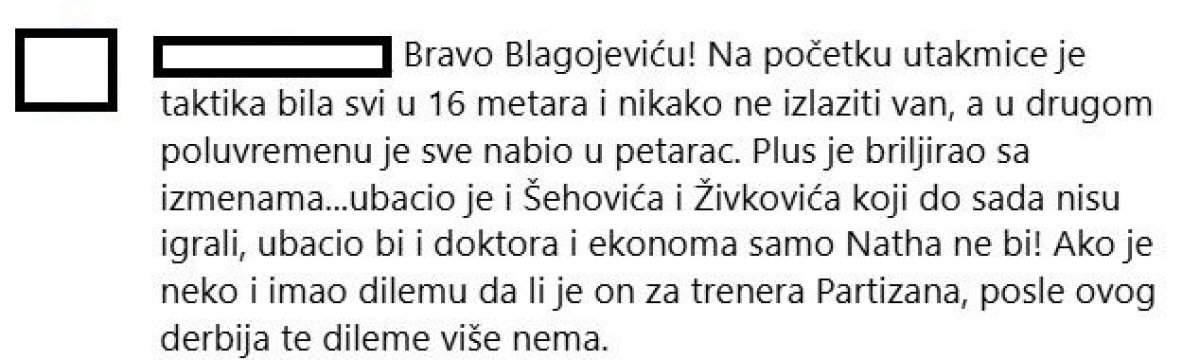 "Bravo Blagojeviću! Na početku utakmice je taktika bila svi u 16 metara i nikako ne izlaziti van, a u drugom poluvremenu je sve nabio u petarac. Plus je briljirao sa izmenama...ubacio je i Šehovića i Živkovića koji do sada nisu igrali, ubacio bi i doktora i ekonoma samo Natha ne bi! Ako je neko i imao dilemu da li je on za trenera Partizana, posle ovog derbija te dileme više nema", komentar je jednog navijača.