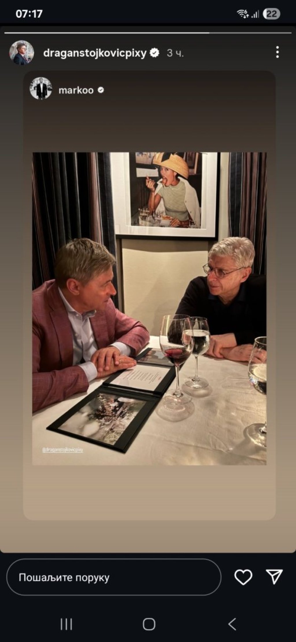 Nekoliko dana kasnije, Stojković viđen je u restoranu u društvu legende Arsenala, čuvenog francuskog stručnjaka Arsena Vengera.