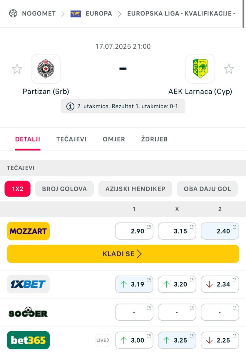 Grci su slavili u prvom susretu na Kipru rezultatom 1:0, pa sa prednošću dolaze na revanš u Humsku. Iako se igra u Beogradu, kladionice i dalje blagu prednost daju gostima sa Kipra. Četiri dana uoči meča, kvote ukazuju na poverenje u tim iz Larnake - pobeda na AEK je 2,40, dok je na trijumf Partizana ponuđena kvota 2,90. Sa druge strane je 3,15 da će meč biti okončan bez pobednika.