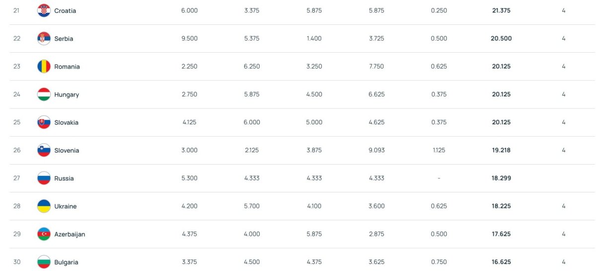 Preti i Ukrajina sa 18,225 bodova, a ne treba zanemariti ni Azerbejdžan, koji ima zaostatak malo ispod 3,000 poena.