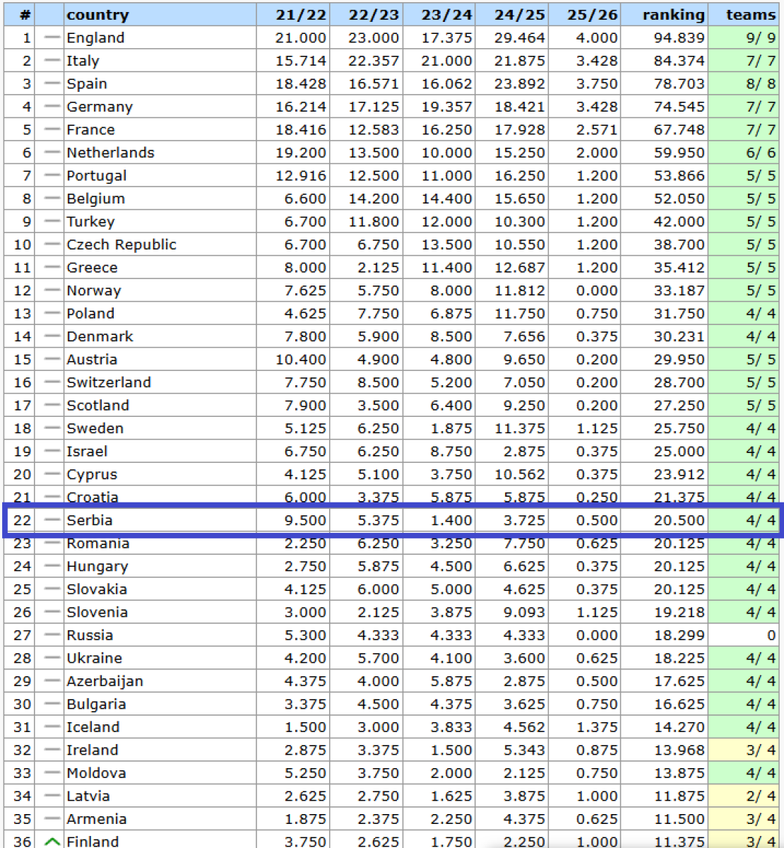 Koeficijent određuje koliko klubova svaka država može imati u Evropi i iz koje faze takmičenja kreću. Trenutno je Srbija 22. na toj listi sa 20,500 bodova, ali sledeće sezone gubi značajnih 9,500 poena osvojenih 2022. godine.