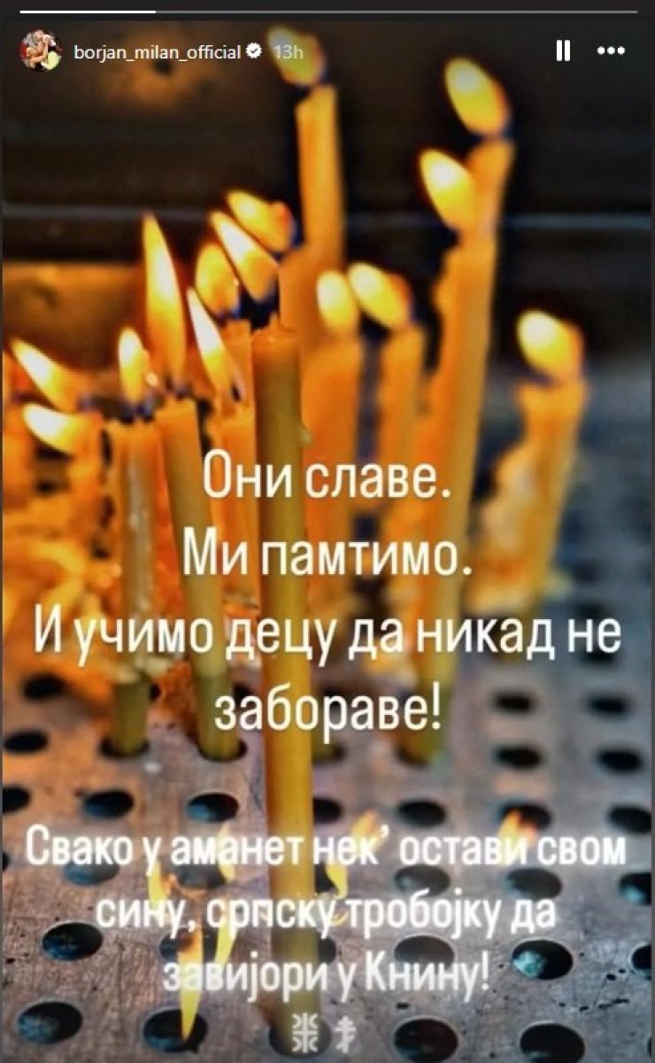 "Oni slave. Mi pamtimo. I učimo decu da nikad ne zaborave! Svako u amanet nek' ostavi svom sinu, srpsku trobojku da zavijori u Kninu", poručio je Milan Borjan.