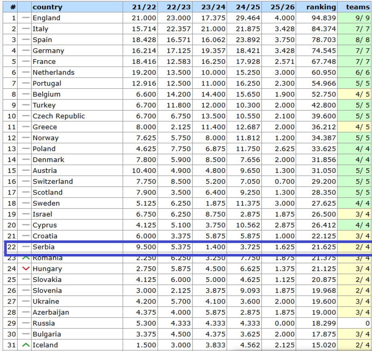 Podsećamo, pobeda u kvalifikacijama vredi jedan poen, a remi 0,5, a osvojeni bodovi se dele sa četiri, koliko je Srbija imala predstavnika ove sezone. UEFA koeficijent računa sa za period od poslednjih pet godina i na osnovu njega rangiraju se zemlje, kao i klubovi. Broj poena određuje učinak zemlje tokom jedne sezone u evropskim takmičenjima. Počevši od poena za pobedu ili remi u kvalifikacijama, potom za pobedu ili remi u grupnoj fazu, da li je ušao u grupnu fazu takmičenja, da li je uspeo da prođe grupnu fazu i prođe u narednu rundu... Takođe, učešće u grupnoj fazi Liga šampiona donosi četiri poena, kao i nokaut faza.
