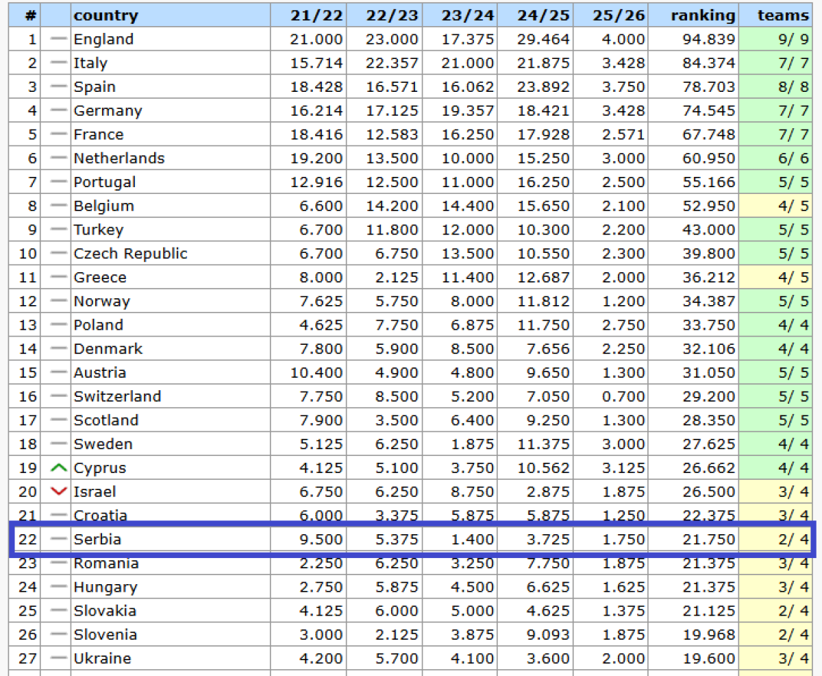 Hrvati su i dalje jedno mesto bolje plasirani od nas sa 22,375 poena, Rijeka je prošle nedelje poražena od Šelburna (2:1), ali se sad revanširala sa 3:1, prošla dalje i donele bodove, Hajduk je pobedio Tiranu (2:1) u prvoj utakmici, a čeka ga i revanš. Izrael je 20. sa 26,500 poena, slede Kiprani koji imaju 26,662, Švedska je 18. sa 27,625 bodova, Škotska ima 28,350, na 16. poziciji je Švajcarska sa 29,200 bodova, a 15. je Austrija sa 31,050 bodova.