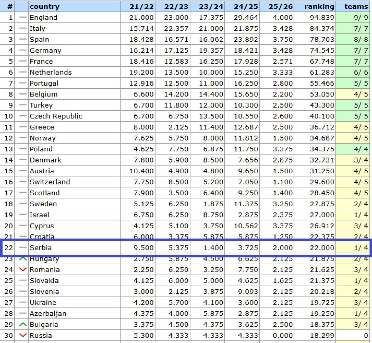 Srbija je i dalje 22. na UEFA listi sa 22,000 bodova. Sledi nam žestoka bitka da ostanemo na toj poziciji jer nam prete sa svih strana. U slučaju da izgubimo 22. mesto kvalifikacije bi naš šampion mogao da počinje od prvog kola za dve godine. S druge strane, napredovanje na UEFA listi znači preskakanje kola u kvalifikacijama i potencijalno čak i direktno mesto u Ligi šampiona, ali od te pozicije je Srbija trenutno izuzetno daleko. Ova sezona je izuzetno bitna, pa će što bolji rezultati večitih značiti svim klubovima u ligi. Naši klubovi brane čak 9.500 iz sezone 2021/2022. To znači da je to gotovo polovina bodova jer je sezonu kasnije osvojeno 5.375, a onda samo 1.400.