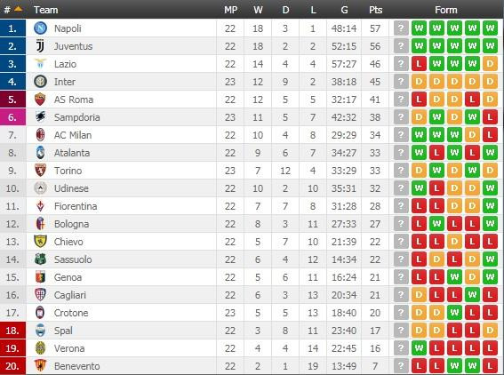 Na drugoj strani, Krotone je na 17. mestu sa 20 bodova.