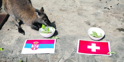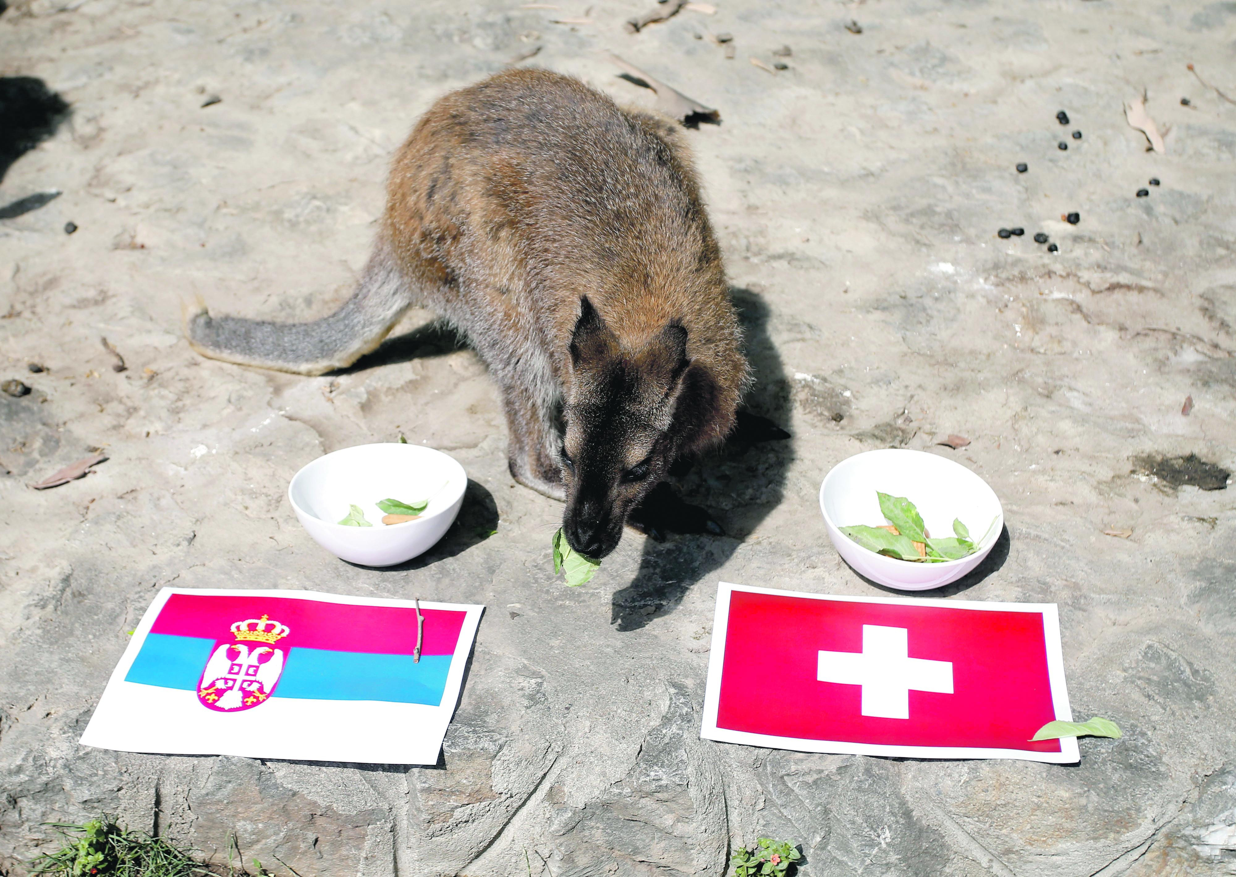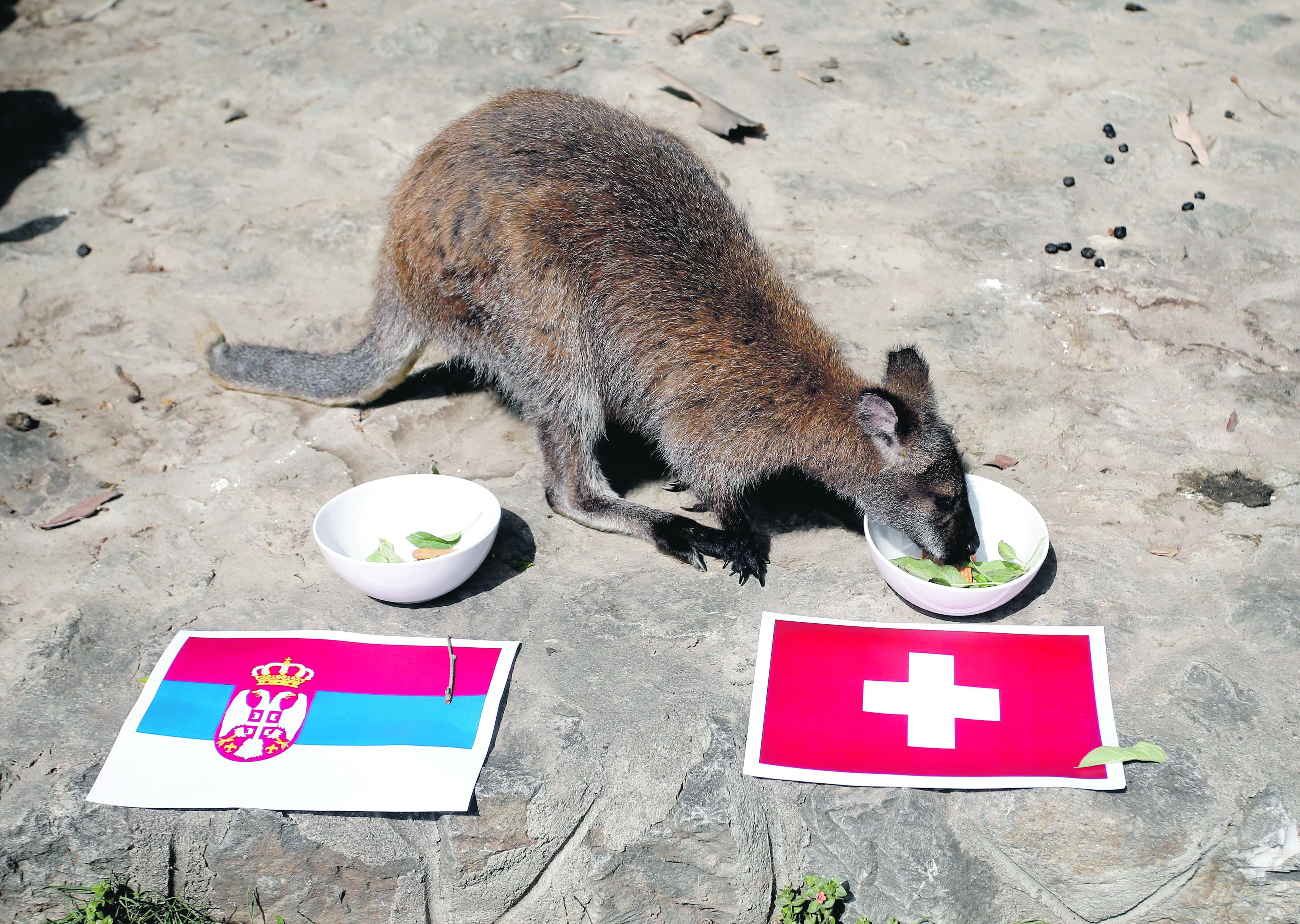 Ženka kengura dobila je dve iste činije sa hranom, ispred jedne je bila postavljena zastava Srbije, a ispred druge zastava Švajcarske.