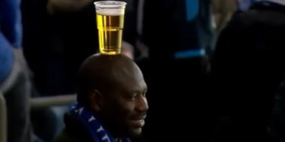 On je za svega nekoliko sekudni snimka postao legenda. Do svog mesta na stadionu prošetao je više nego elegantno. Želeo je da popije pivo, a doneo ga je na specifičan način - na glavi.