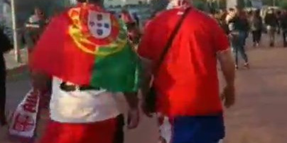 Naše kamere zabeležile su kako dva momka, jedan sa zastavom Srbije, a drugi sa obeležjima Portugala zajedno pristižu na "La Luž" kako bi bodrili svoje reprezentacije.