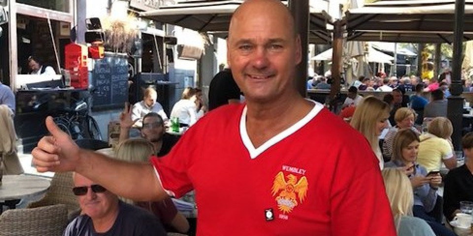 Grupa starijih pristalica iz Mančestera, sa dresovima kluba iz 1958. godine, obeleženim simboličnim satom velike tragidije Junajteda u Minhenu u povratku sa meča protiv Crvene zvezde, jedna je od upečatljivijih u centru srpske prestonice.