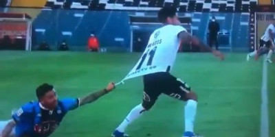 Kapiten Huačipata uhvatio je domaćeg fudbalera za dres kako bi ga sprečio da krene u kontru. Ali, to povlačenje, je trajalo, trajalo, trajalo....