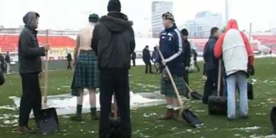 Uzeli su lopate i pomogli da se očisti sneg sa terena. Mnogi od njih su samo u tradicionalnim kiltovima, sa loptama u rukama, sklanjali beli pokrivač sa trave, u momentu oduševili Srbe.