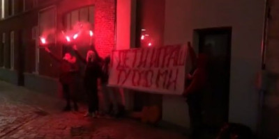 Mala grupa navijača crveno-belih skupila se u ovom belgijskom gradu i uz pesmu i bakljadu ohrabrila ljubimce. Razvijen je transparent s porukom "Gde ti igraš, tu smo mi".