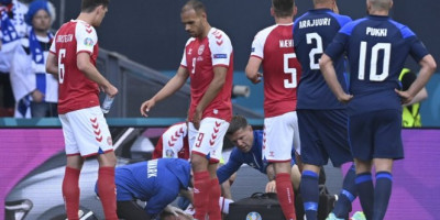 Jezivo! Iskusni vezista Danske Kristijan Eriksen srušio se na teren u 45. minutu meča sa Finskom, nadomak leve aut-linije, posle čega je nastao tajac na Parken stadionu u Kopenhagenu