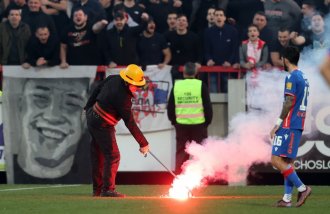 U 24. minutu susreta, neko iz publika bacio baklju koja je završila na fudbalskom terenu.
