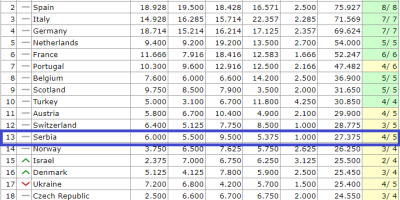 Srbija je već sa 11. skliznula na 13. mesto i ima sada 27.375 poena. Norvežani, Izraelci, Danci i Ukrajinci su trenutno na bezbednoj distanci, ali je pitanje da li će tako ostati. Kompletan učinak deli se sa pet, brojem učesnika u Evropi. Partizan se najverovatnije oprošta od Evrope posle debakla protiv Danaca, a odavno znamo da ćemo uz Crvenu zvezdu tokom jeseni u grupama imati još dva predstavnika - TSC i Čukarički. Pred njima će biti izuzetno teška misija u borbi za nacionalni koeficijent i da sačuvaju Srbiji što bolju poziciju. Trenutno su srpski klubovi za nacionalni koeficijent ove sezone osvojili 1.000 (0.800 za startno učešće Zvezde i 0.200 za Partizanovu pobedu nad Sabahom u revanšu).