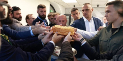 Tačno u podne je obavljen ritual sečenja kolača koji je obavio jerej Goran Đukić iz hrama Svetog Arhangela Gavrila.