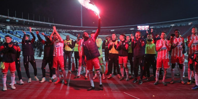 Navijači Crvene zvezde slave posle pobedu u večitom derbiju (3:2), pa likuju i prozivaju "grobare" koji su besni, pljuju sudiju, smatraju da su pokradeni.