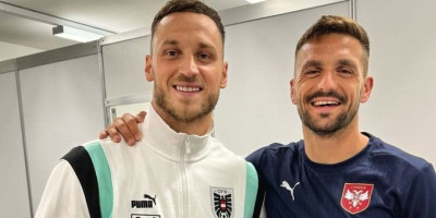 "Srdračan susret Marka Arnautovića i Dušana Tadića uoči poslednjeg treneinga pred sutrašnju utakmicu Austrije i Srbije", objavio je FSS pored slike dvojice igrača.