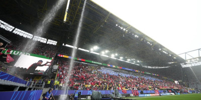 We have inclement weather here in Dortmund. And an Old Trafford roof scenario at both ends before Turkey-Georgia. Serious storm. That water is coming down hard on the fans in lower tiers. pic.twitter.com/uhGXNg0ZpI