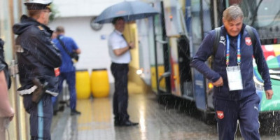 Očekivano, igrači i stručni štab su bili raspoloženi kao i vreme, dok je selektor Dragan Stojković Piksi, bukvalno pokisao.