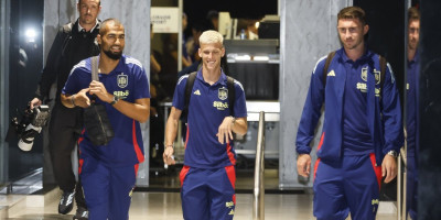 Ekspedicija Španije izašla je iz aerodromske zgrade na VIP izlaz pola časa posle sletenja, predvođena selektorom Luisom de la Fuenteom i prvim zvezdama ekipe Laminom Jamalom, Nikom Vilijamsom, Danijem Olmom, Fabijanom Ruizom, kao i Rodrijem koji zbog suspenzije neće igrati protiv "orlova".
