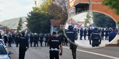 U toku je utakmica Novi Pazar - Partizan, a huligani pokušavaju da probiju kordon kako bi prišli stadionu gde se održava meč.