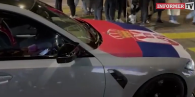 Na putu ka stadionu "Lecigrund", u neposrednoj blizini, naš izveštač primetio je nesvakidašnji prizor - sivi automobil marke "BMW" sa velikom srpskom zastavom istaknutom na haubi.
