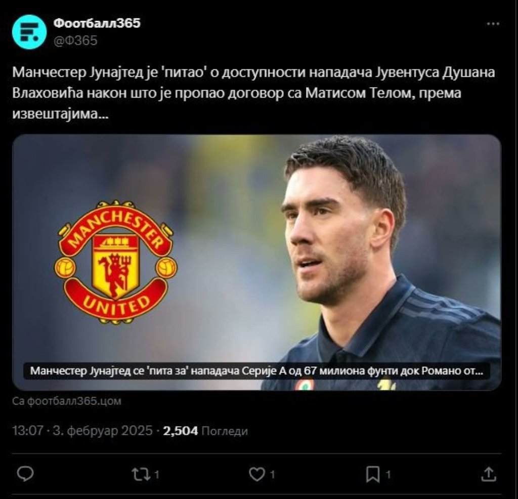 Prema najnovijim informacijama i pisanju engleskih medija, konkretno "Fudbal365", kontakti sa Juventusom za Vlahovića su već uspostavljeni. "Stara dama" bi mogla da razmotri prodaju srpskog napadača ako dobije odgovarajuću ponudu, ali veliko je pitanje koliko su "crveni đavoli" spremni da plate.