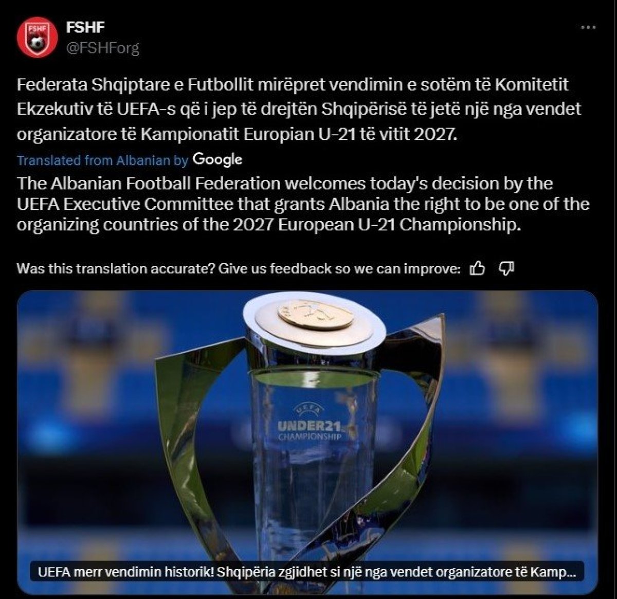 "UEFA donosi istorijsku odluku! Albanija izabrana za jednu od zemalja domaćina Evropskog prvenstva U-21 2027. Fudbalski savez Albanije pozdravlja današnju odluku Izvršnog komiteta UEFA kojom se Albaniji daje pravo da bude jedna od zemalja organizatora Evropskog prvenstva U-21 2027. godine. Na ovom turniru, koji će se održati u junu 2027. godine, učestvovaće 16 timova koji predstavljaju najistaknutije omladinske fudbalske talente u Evropi, uključujući igrače koji su već aktivni u najvišim ligama kontinenta. Kao jedna od zemalja domaćina, Albanija će po prvi put imati priliku da predstavlja svoju novu generaciju fudbalera U-21 na velikom međunarodnom turniru", saopštio je albanski savez.