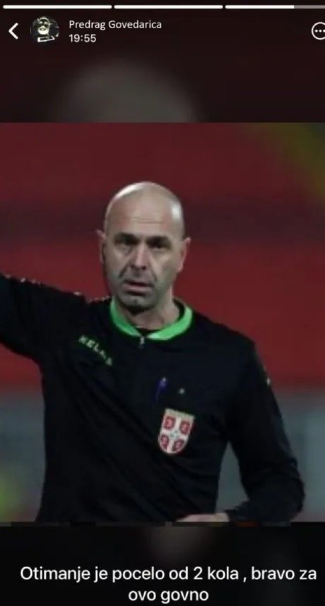 Govedarica je u svom postu aludirao da je njegov tim oštećen zbog grešaka Ostraćanina, njegovu arbitražu nazvao je "otimanjem", pa je sve to podelio na "Whatsapp" statusu, što su mogli da vide ljudi koji imaju njegov broj telefona.