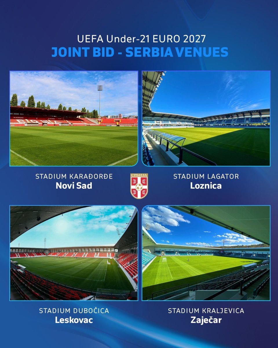 "Loznica i stadion 'Lagator' biće zajedno sa zaječarskom lepoticom 'Kraljevica' i leskovačkim Teatrom snova 'Dubočica', uz renovirani 'Karađorđe' u Novom Sadu, domaćini narednog Prvenstva Evrope za mlade koje Srbija organizuje zajedno sa Albanijom 2027. godine", piše u objavi FSS.