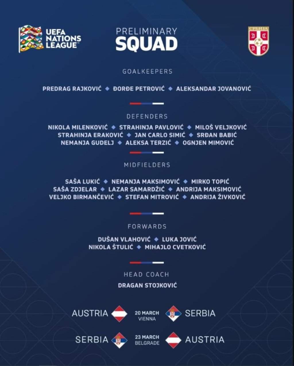 Selektor Dragan Stojković Piksi (60) objavio je širi spisak igrača za predstojeće baraž mečeve reprezentacije Srbije, protiv Austrije, za opstanak u A diviziji Lige nacija.