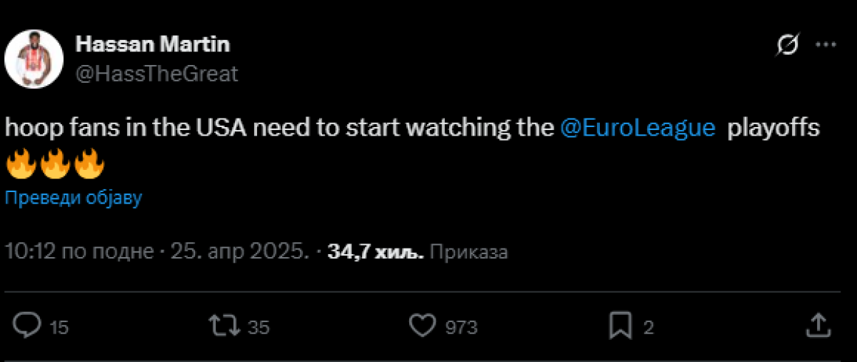 Martin je na društvenim mrežama napisao: "Ljubitelji košarke iz Amerike, vreme je da počnete da pratite Evroliga plejof."