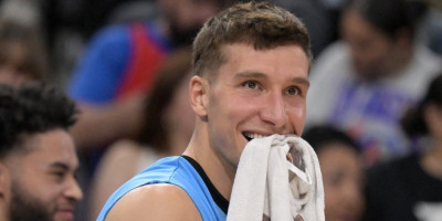 Košarkaš Los Anđeles Klipersa i kapiten reprezentacije Srbije Bogdan Bogdanović, zajedno sa centrom Sakramento Kingsa Jonasom Valančijunasom i legendom Tonijem Parkerom gleda utakmicu Fenerbahčea i Panatinaikosa na fajnal-foru Evrolige.