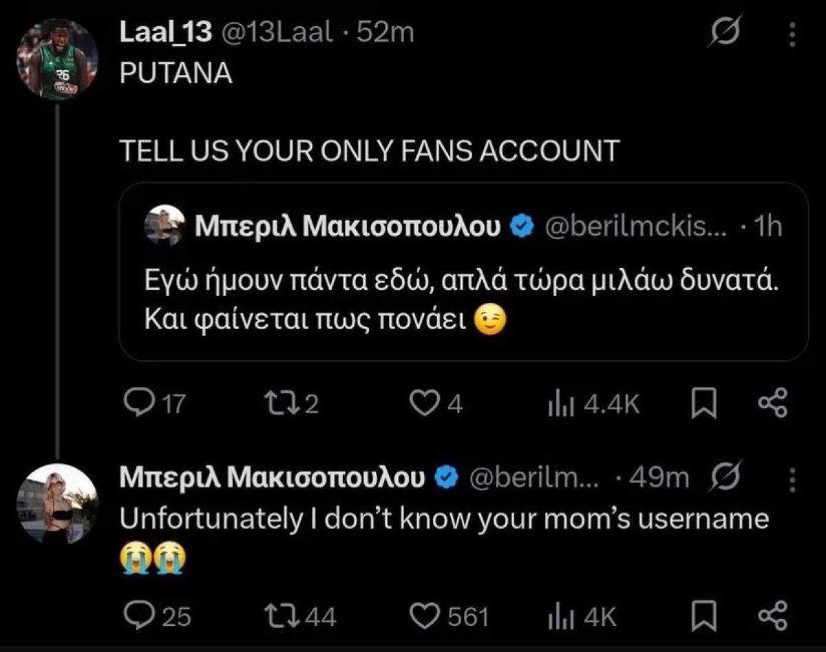 Nakon sinoćnjeg meča između Panatinaikosa i Olimpijakosa (88:99), Beril Mekisik, supruga Šekila Mekisika, oglasila se na društvenim mrežama povodom incidenta na terenu. Njene objave očigledno su zasmetale velikom broju navijača, koji su je u komentarima kritikovali i optužili da ima profil na platformi "Onli fens", poznatoj po deljenju eksplicitnog sadržaja.