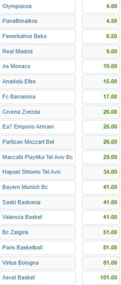 Kao prvi favorit za tron Evrope ponovo se izdvaja Olimpijakos. Trećeplasirani tim iz prošle sezone prednjači sa kvotom 4, dok je veliki atinski rival Panatinaikos odmah iza sa 4,50.